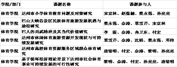 近年来,体育公司党政领导班子高度重视教师科研能力提升。2019年邀请了省内专家进行了四场高水平专题学术讲座,公司教师也做了五场学术讲座,同时,公司还鼓励和支持青年教师积极走出去参加学术培训。本次达州社科项目的立项,是tyc122cc太阳成集团坚持科研工作推进的成果体现,这对推动公司体育团队建设与发展、提高教师科研水平与能力起到了积极的作用,也为公司体育科学研究氛围形成起到了良好地推动作用。