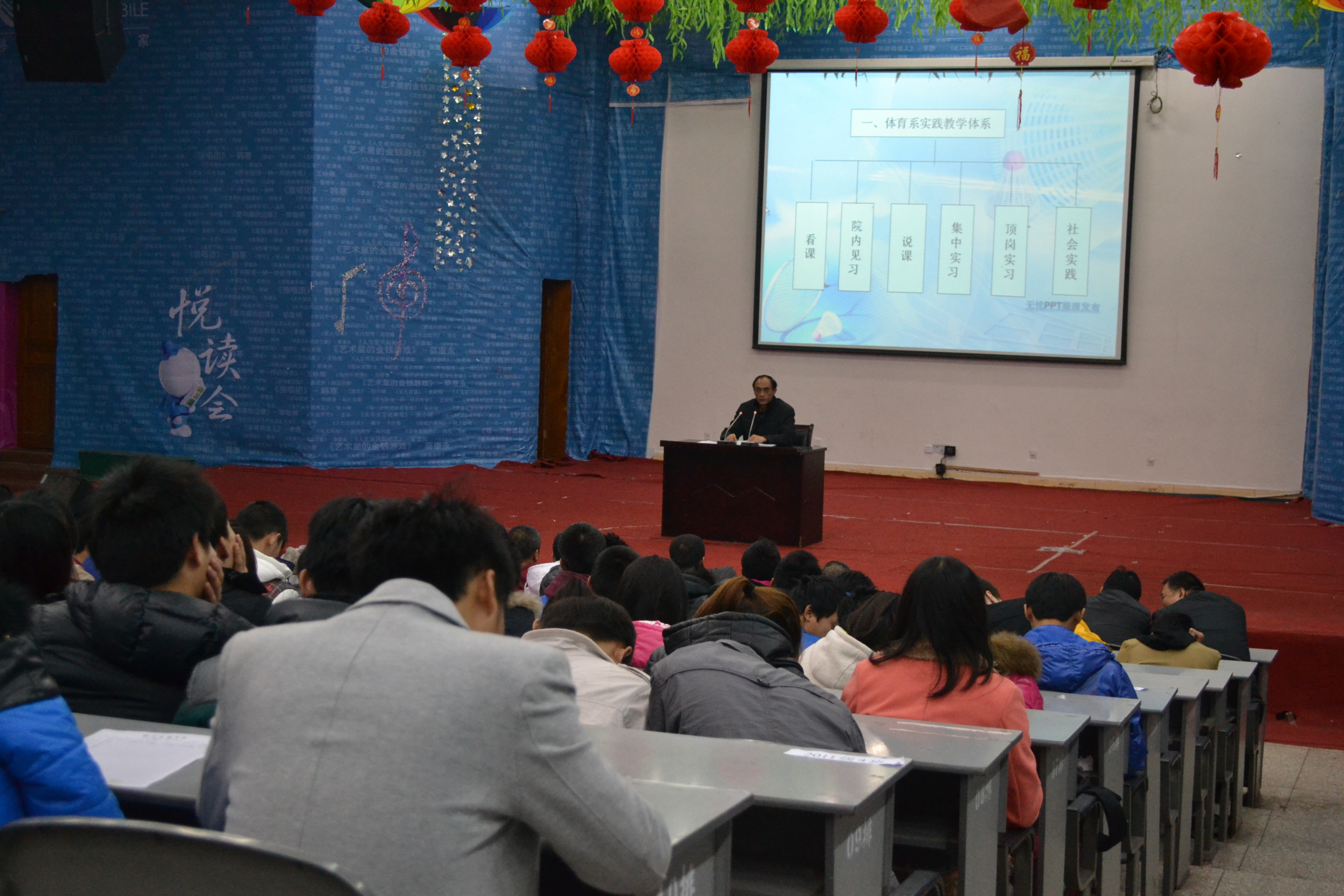 2012年12月10日晚7点,陈碧述教授在tyc122cc太阳成集团莲湖校区126教室作题为“抓好实践教学 夯实就业基础”的学术讲座。本次讲座由体育系主任董立教授主持,体育系部分教师及300余名员工到场聆听。