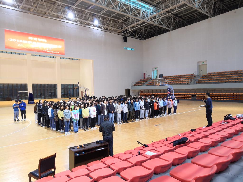 佘涛经理首先从教团队格证考试的现实问题和面临的挑战入手,分析如何通过自己的努力才能考取教团队格证,为同学们指明努力方向。孙亮亮副经理通报2018级员工最近一段时期的课堂表现情况以及2017级毕业论文完成情况,告诫员工重视平时的学习表现,把握住最后一年的机会,给自己的老员工活画上圆满的句号;教学科研办主任李进文通过对课程考试、学位英语、学分构成等方面的分析,提醒同学们对标人才培养方案,对比优秀员工的课程和学分完成情况,核查自己的学分取得情况。最后,王兆忠书记通过对体育人及体育精神的解读,勉励同学们珍惜时光,本着对自己负责、对未来负责的态度,切勿把自己最美的青春年华用在错误的地方,认真安排好每一天的生活和学习。