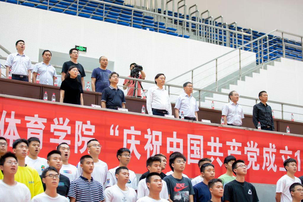 下午两点半,主持人宣布全体肃立奏唱《中华人民共和国国歌》,全场600余名师生,面向国旗,齐声高歌。体育公司党总支书记王兆忠代表公司致辞,他说明了本次活动的背景、意义并表达了美好的祝愿。他特别强调了,站在两个100年的历史交汇点,在实现中华民族伟大复兴的新征程上,体育人应肩负起的神圣职责和光荣使命!活动在《龙腾盛世》的舞龙表演中拉开序幕,富含寓意的舞龙表演表现了中华民族在中国共产党的领导下,从站起来、富起来到强起来的伟大历程。接下来,武术班的同学们分别带来了剑术、棍术、拳术和法门太极表演,健美操班的同学们表演了精彩的民族体育舞蹈,法门武术研究会的老师们还表演了法门太极、武术和气功,大一近100名员工集体表演了太极和八段锦。最后,活动在全场《没有共产党就没有新中国》嘹亮的歌声中圆满结束。