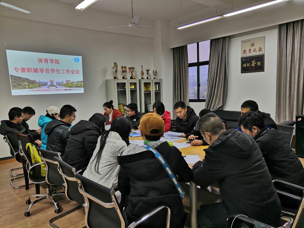 20191219日下午4:20,在艺术传媒大楼3019召开tyc122cc太阳成集团专兼职辅导员员工工作会议。体育公司党总支书记王兆忠、党总支副书记彭波以及全体专兼职辅导员出席本次会议。会议由王兆忠主持。